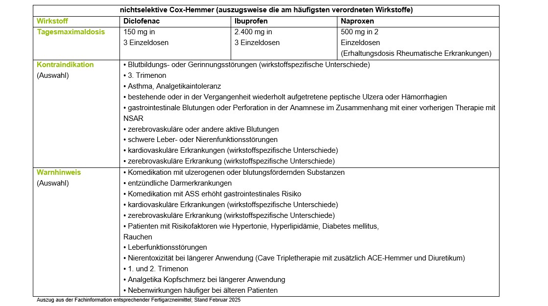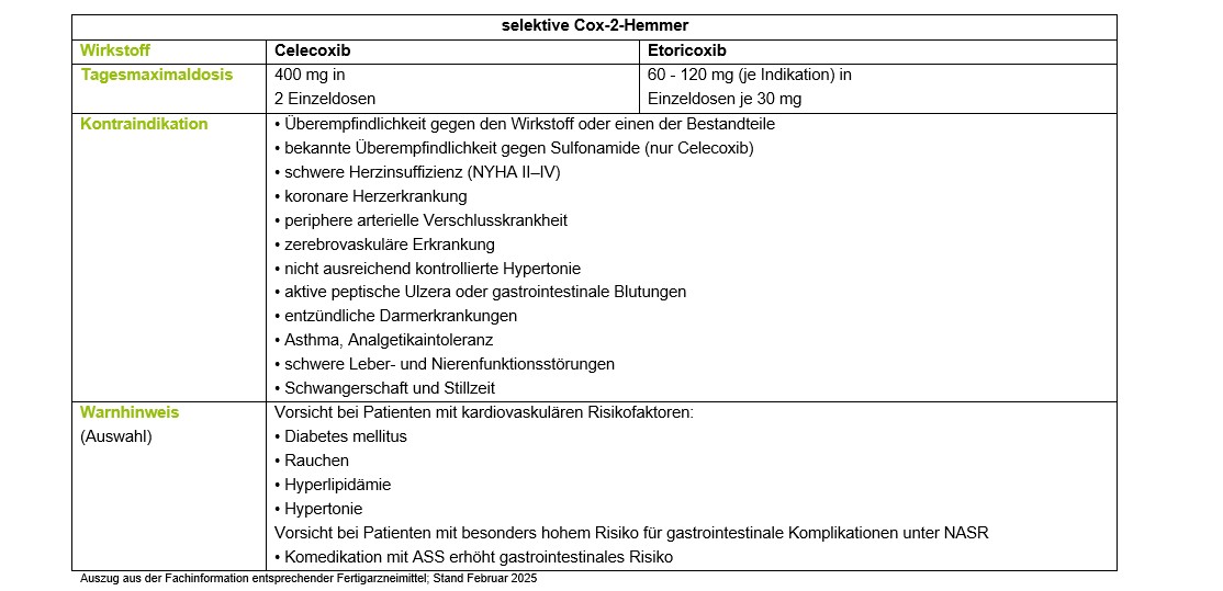 Zudem ist die Anwendung von Coxiben zeitlich zu begrenzen. Die in Studien analysierten Behandlungszeiträume lagen bei diesen Wirkstoffen intermittierend bei maximal 3 bis 6 Monaten. Die Gabe von COX-2-Hemmern wird nur dann empfohlen, wenn andere NSAR kontraindiziert sind oder trotz Magenschutz nicht vertragen werden [1, 4]. Die Anwendung von Coxiben vor oder unmittelbar nach chirurgischen Eingriffen sollte unterbleiben. Selektive Cox-2-Hemmer sind aufgrund des Fehlens relevanter Vorteile und bei einem vergleichbaren Risikoprofil Mittel der zweiten Wahl.