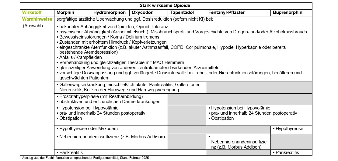 Beim nicht-tumorbedingten Schmerz ist die Indikation zur Behandlung mit stark wirksamen Opioiden streng zu stellen. Stark wirksame Opioide sollten nur bei sehr schweren therapierefraktären Schmerzen eingesetzt werden. Die Gabe sollte kurzfristig erfolgen. Tritt die gewünschte Schmerzlinderung/Funktionsverbesserung nicht ein, sollte die Opioidtherapie beendet werden [1].