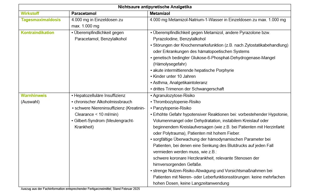 Paracetamol kann bei der Behandlung von leichten bis mittelstarken Schmerzen bei degenerativen Gelenkerkrankungen unter Beachtung von Kontraindikationen, Anwendungsbeschränkungen und Tageshöchstdosen initial eingesetzt werden.