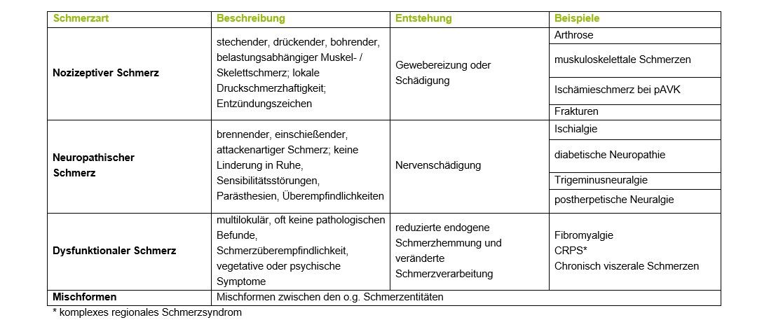 Die spezielle Schmerzanamnese ermittelt die folgenden Anhaltspunkte zur Charakterisierung des Schmerzgeschehens durch Schmerzlokalisation und Ermittlung der Schmerzqualität als Hinweis auf den wesentlichen kausalen Entstehungsmechanismus. Man unterscheidet zwischen nozizeptiven, neuropathischen und dysfunktionalen Schmerzen, wobei auch Mischformen der genannten Schmerzarten existieren.