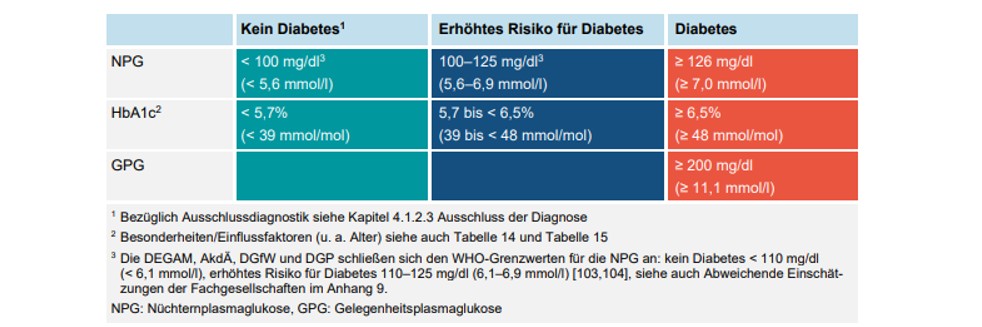 Die Diabetes-Diagnose soll auf Grundlage von mindestens zwei bestätigten Laborwerten gestellt werden (siehe Tab. 1). Hierbei kann die Bestätigung durch eine Wiederholung desselben Parameters, oder die Bestimmung eines der anderen Laborparameter erfolgen (z.B. simultane Bestimmung, Nachbestimmung des HbA1c-Wertes aus derselben Blutprobe oder zeitversetzte Bestimmung). Die Diagnose wird als bestätigt angesehen, wenn zwei Ergebnisse der Laborwerte (Nüchternplasmaglucose (NPG) + HbA1c, NPG + Gelegenheitsplasmaglucose (GPG), 2x NPG, HbA1c + GPG) im pathologischen Bereich liegen. Bei Personen mit bereits bestehenden diabetesspezifischen Symptomen kann auch ein eindeutig pathologisches Ergebnis eines Laborparameters zur Diagnosestellung ausreichend sein.