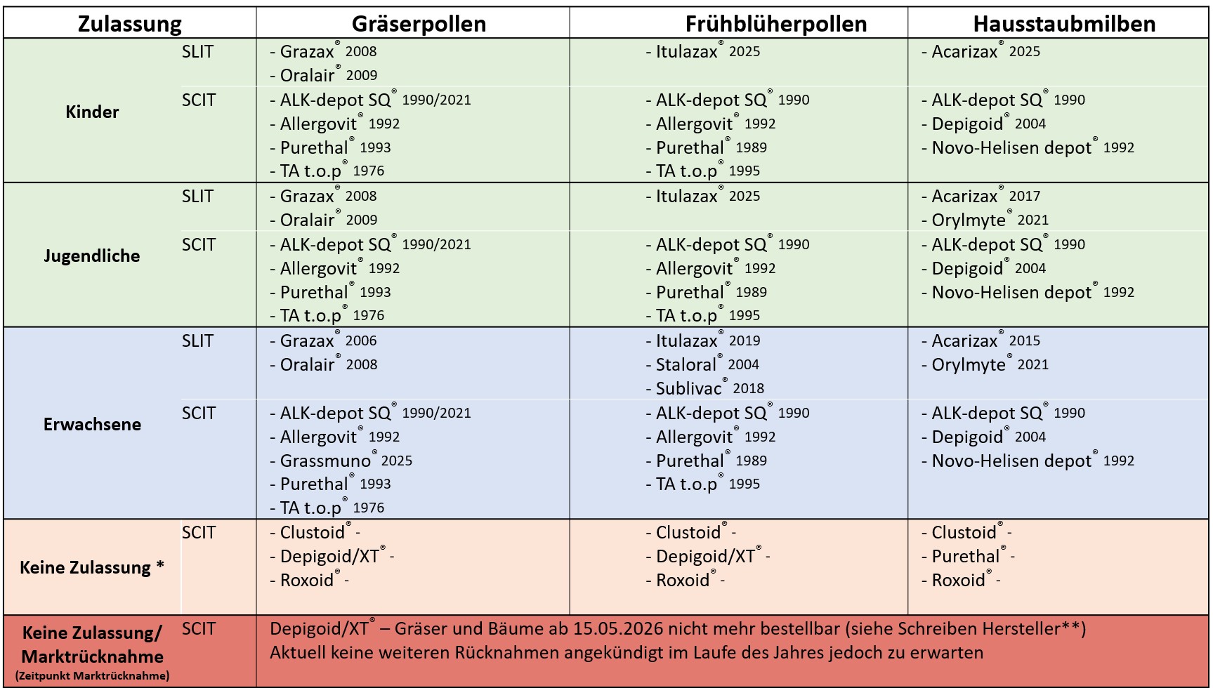 Tab. 1 Übersicht Therapieallergene nach Zulassung, Applikationsform und Altersgruppe (alphabetische Sortierung)
